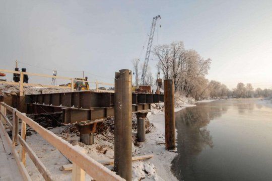 Вибропогружение трубы и шпунтовых свай при строительстве временного моста, выполненное специалистами «АрктикГидроСтрой»