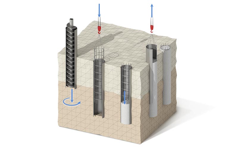 В условиях сложных рыхлых грунтов, где стенки скважины легко разрушаются, мы используем технологию буронабивных свай с обсадной трубой.